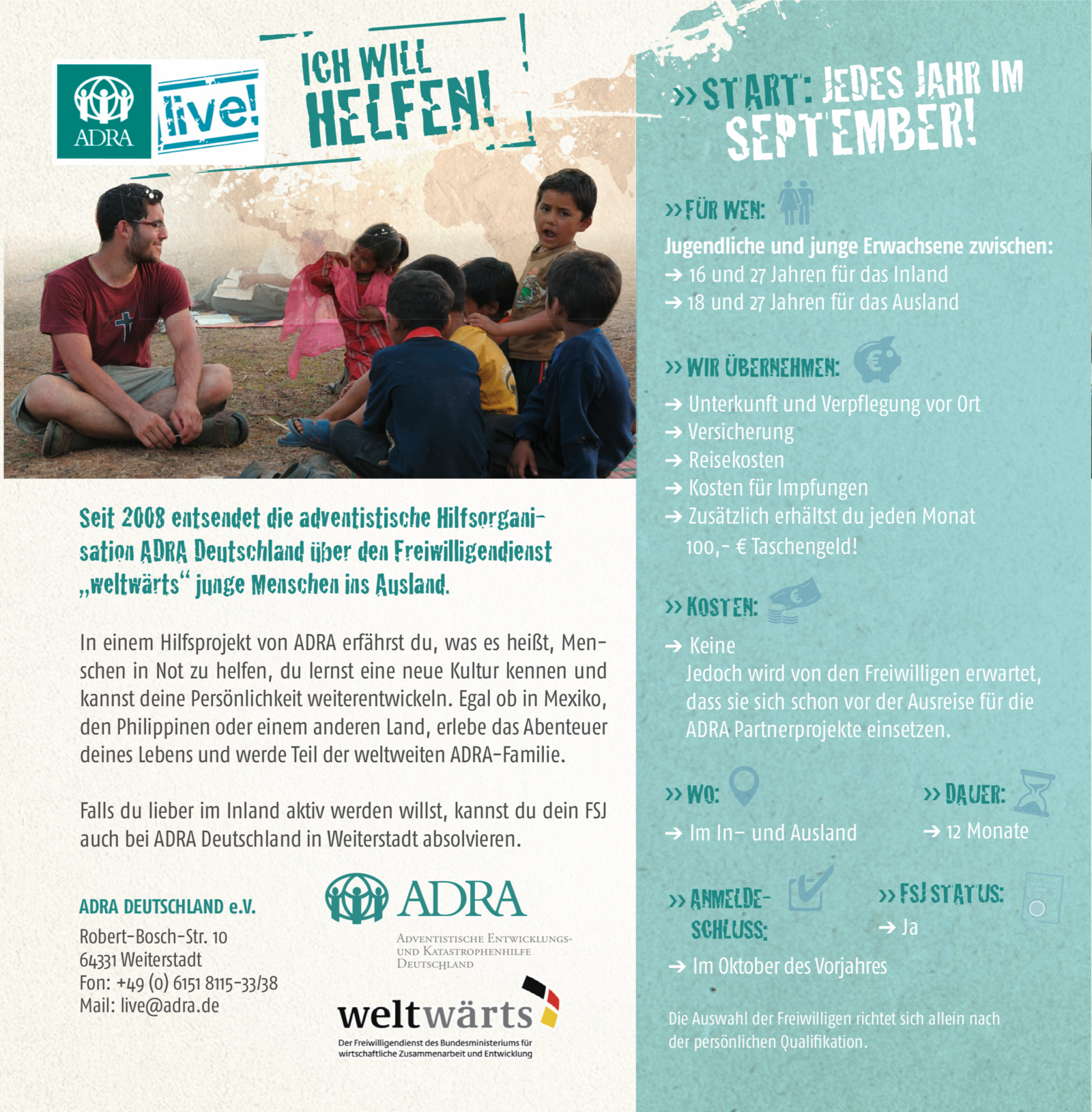 Die Freiwilligendienste 1year4jesusADRA live! und adventist youth service bieten jungen Menschen die Möglichkeit, an sozial ausgerichteten Projekten auf der ganzen Welt teilzunehmen. Hier könnt ihr euch einen Überblick über Inhalte, Kosten, Anmeldeschluss etc. verschaffen.