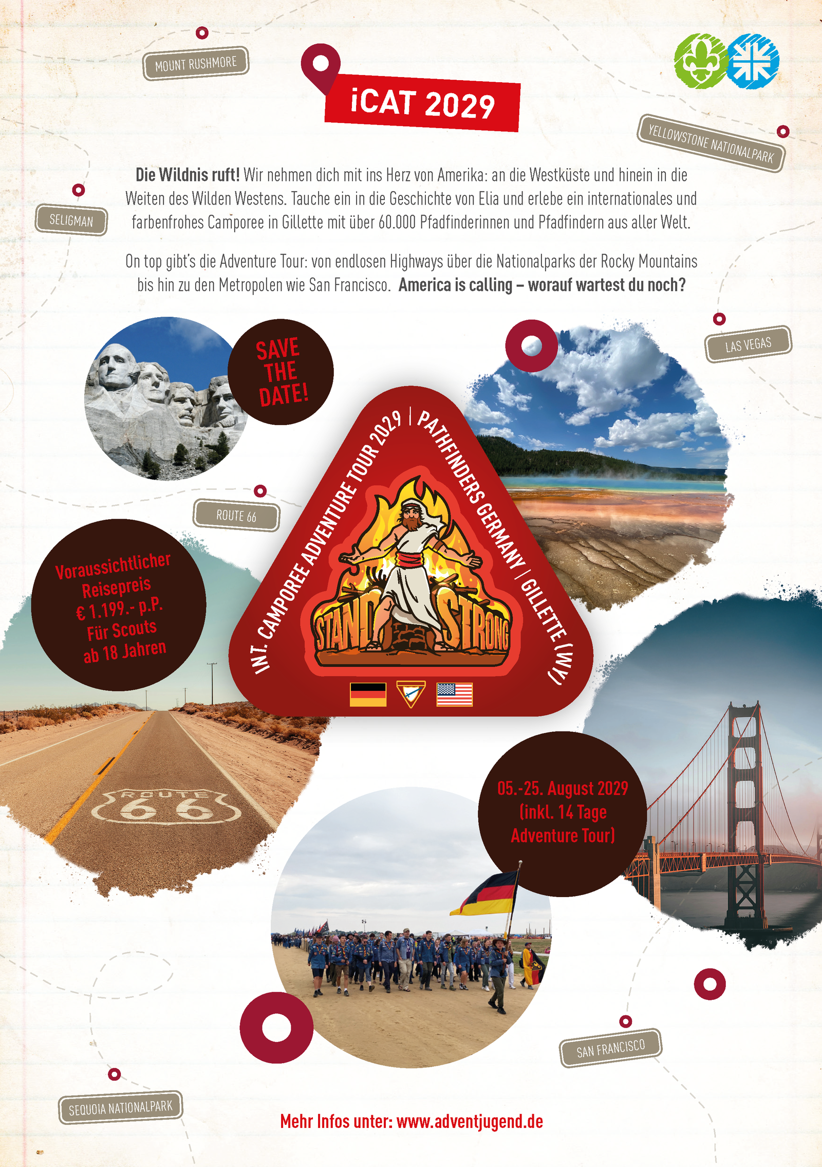 60.000 Pfadfinder aus über 65 Ländern werden beim internationalen Camporee vom 06.-12. August 2029 in Gillette (WY), Amerika erwartet. Sei du einer davon, der sich begeistern lässt von der beeindruckenden Umsetzung des Mottos „Stand Strong“, durch das wir die biblische Geschichte des Propheten Elias erleben werden! Besuche einen der unzähligen Workshops und tauche ein in das weltweite Pfadfinderleben! Entdecke auf der anschließenden